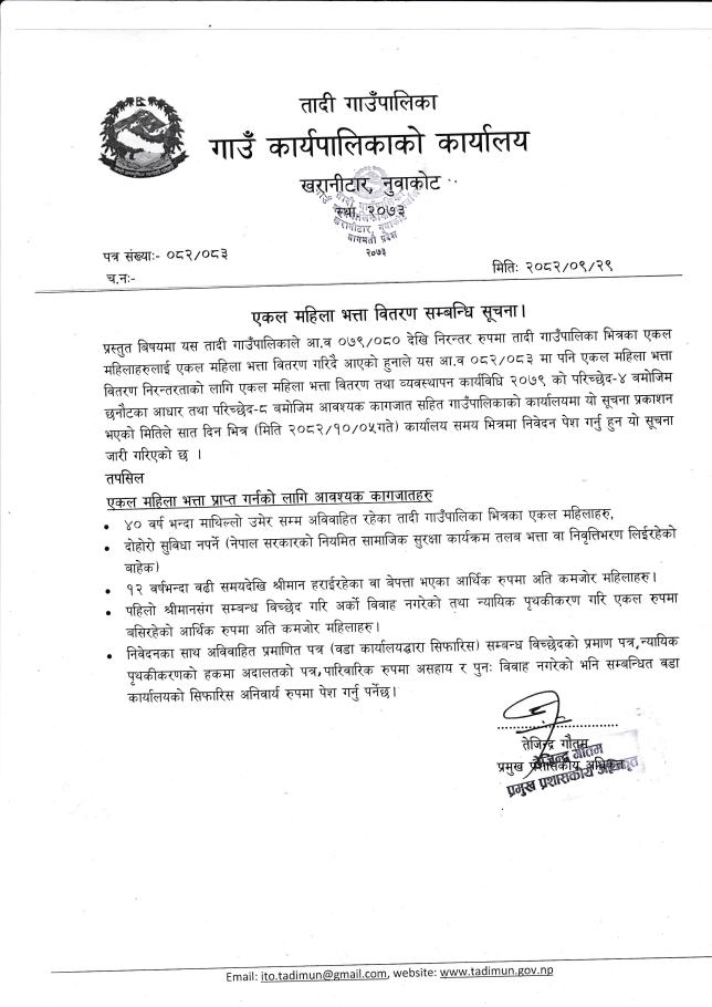 एकल महिला भत्ता वितरण सम्बन्धी सूचना(प्रकाशित मिति २०८२।०९।२९)