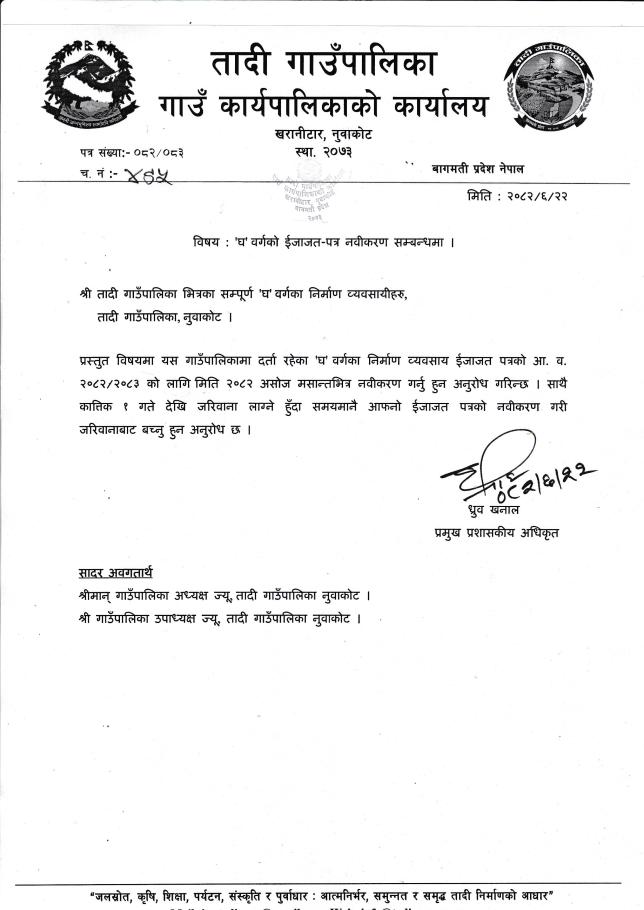 'घ' वर्गको ईजाजत–पत्र नवीकरण सम्बन्धमा (प्रकाशित मिति २०८२।०६।२२)