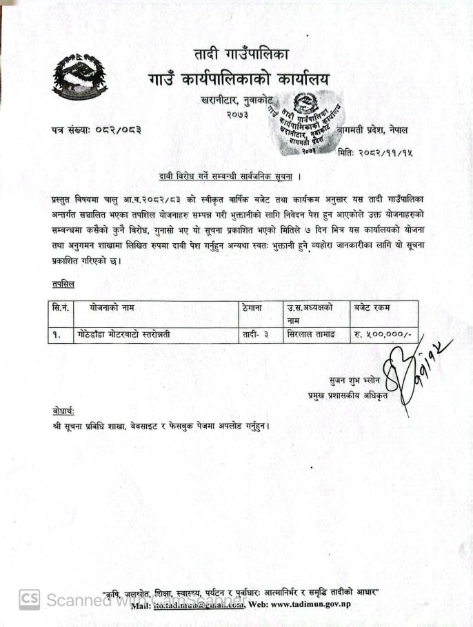 दावी विरोध गर्ने सम्बन्धी सार्वजानिक सूचना(प्रकाशित मिति २०८२।११।१५)