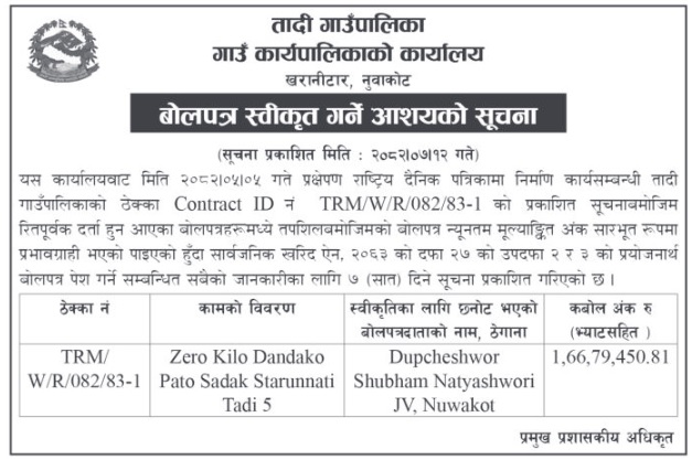 बोलपत्र स्वीकृत गर्ने आशयको सूचना(प्रकाशित मिति २०८२।०७।१२)