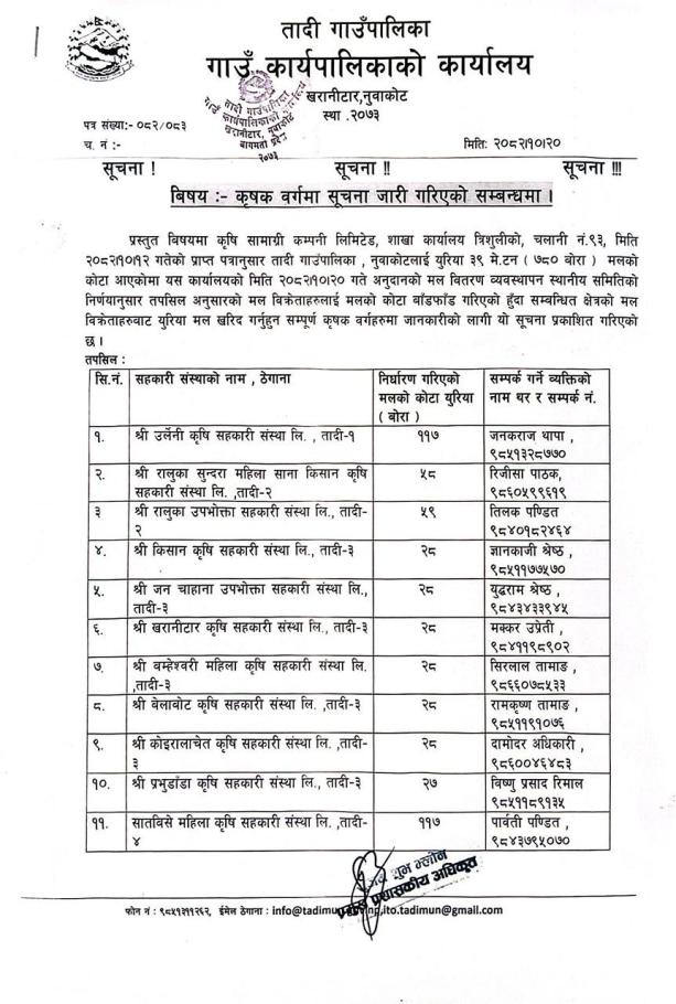 कृषक बर्गमा सूचना जारि गरिएको सम्बन्धमा(सूचना प्रकाशित मिति २०८२।१०।२०)
