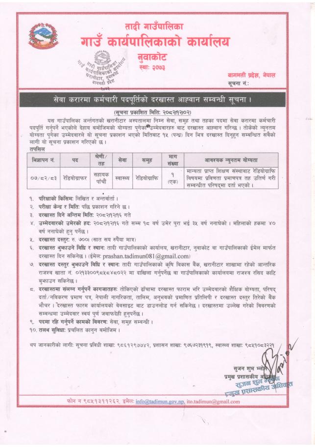 सेवा करारमा कर्मचारी पदपुर्तिको दरखास्त आह्वान् सम्बन्धी सूचना(२०८२।१२।०२)