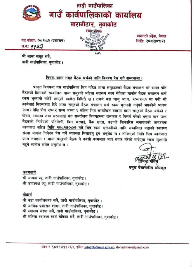 आमा समुह बैठक खर्चको लागि विवरण पेस गर्ने सम्बन्धमा(सूचना प्रकाशित मिति २०८२।०९।२३)