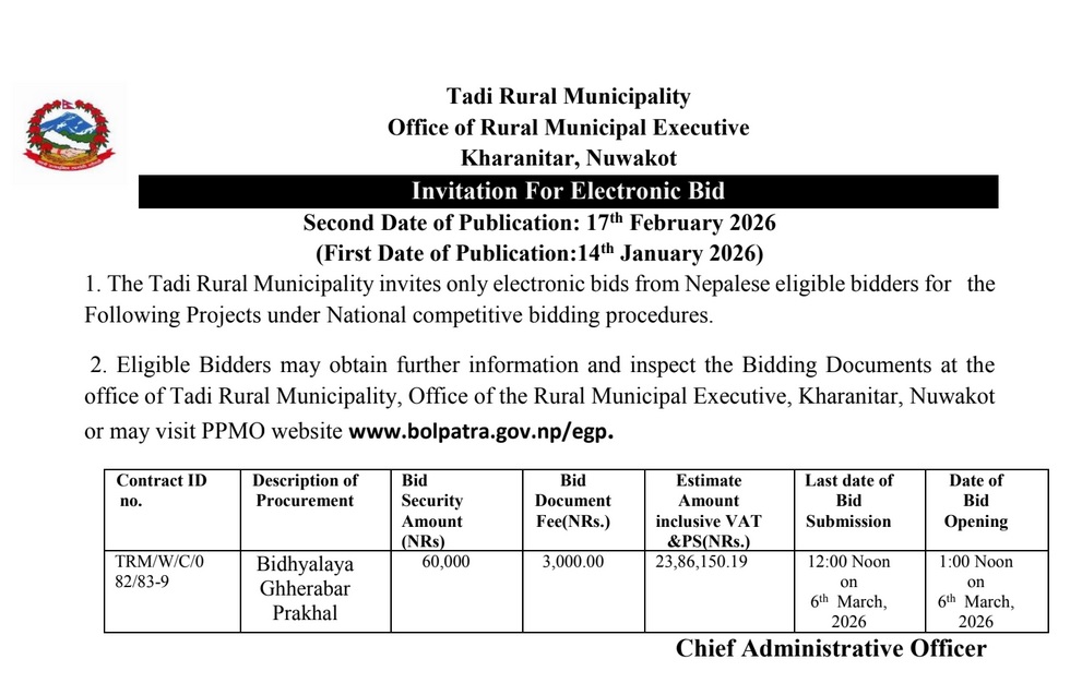 निर्माण कार्य गर्ने सम्बन्धि वोलपत्र अह्वानको सूचना (दाेस्राे पटक प्रकाशित मिति २०८२।११।०५)