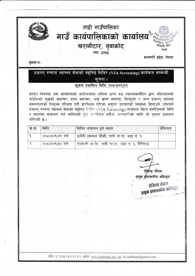 प्रजनन् रुग्णता स्वास्थ्य सेवाको स्कृनिङ्ग शिविर कार्यक्रम सम्बन्धी सूचना(प्रकाशित मिति २०८२।०९।२२)