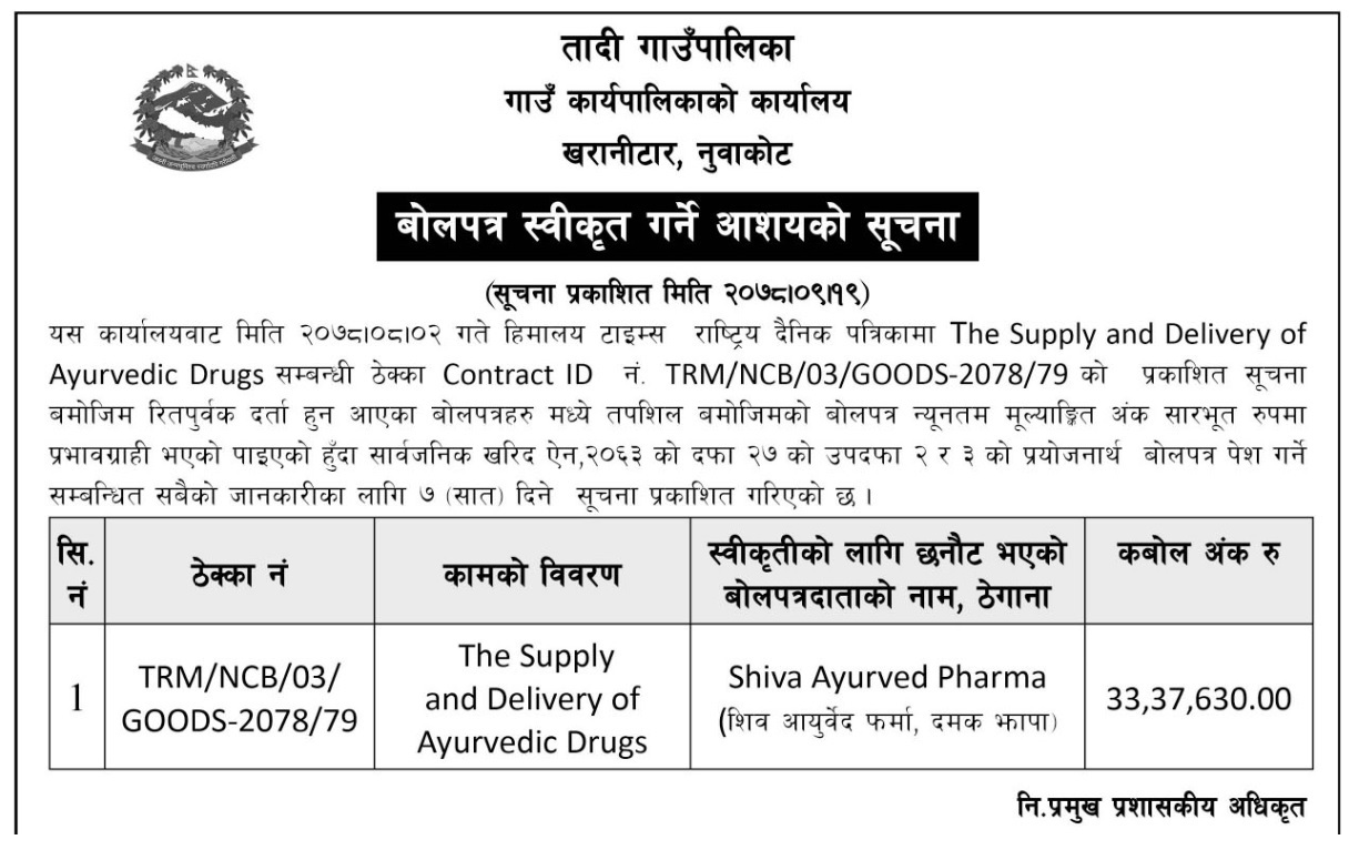 वोलपत्र स्वीकृत गर्ते आशयको सूचना ।