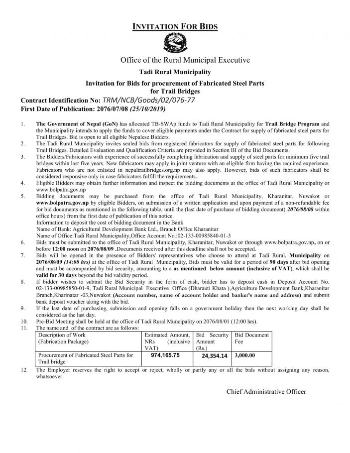 सार्वजनिक खरिद सम्बन्धि वोलपत्र आह्वानको सूचना (प्रथम पटक प्रकाशित मिति २०७६/०७/०८)