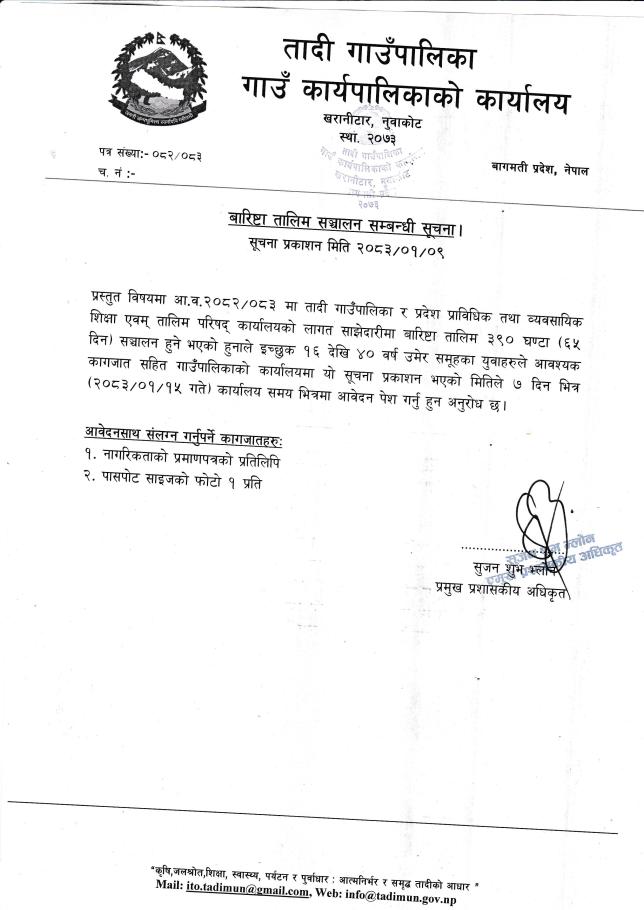 बारिष्टा तालिम संचालन सम्बन्धी सूचना-सूचना प्रकाशित मिति २०८३।०१।०९)
