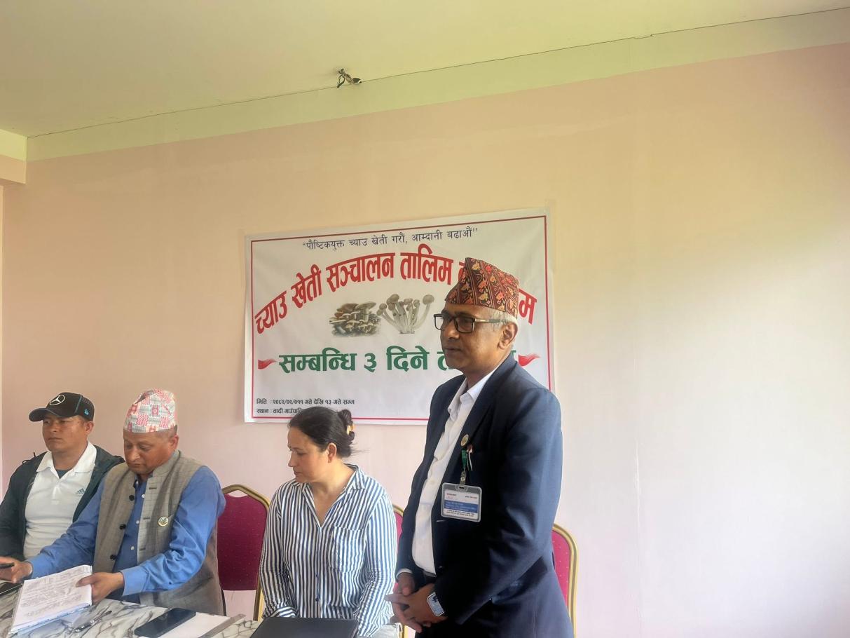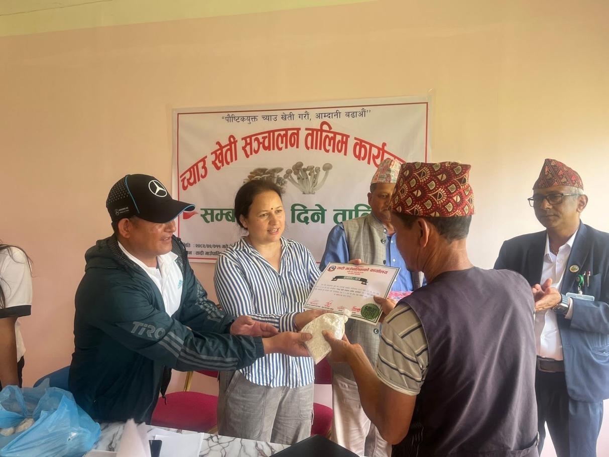 आज मिति २०८२।०२।१३ गते तादी गाउँपालिकाको आयोजनामा तादी गाउँपालिका उपाध्यक्ष श्री सन्जु प्याकुरेलज्यूको अध्यक्षता,प्रमुख अतिथि प्र.प्र.अ ध्रुब खनालज्यू,विशेष अतिथि वडा अध्यक्षहरु नकुर दोङ तामाङज्यू, सरोज भण्डारीज्यू,कृषि अधिकृत श्री नविन राना मगरज्यूको आतिथ्यतामा च्याउ खेती सम्बन्धि मिति २०८२।०२।११ देखी २०८२।०२।१३ गते सम्म संञ्चालन भएको ३ दिने तालिम कार्यक्रम स्थानिय कृषकहरुको उल्लेख्य सहभागितामा, सहभागि कृषकहरुलाई प्रमाणपत्र समेत वितरण भई सम्पन्न भयो ।यस कार्यक्रमबाट स्थानीय स्तरमा च्याउ खेतीको प्रवर्द्धन हुने, स्वरोजगारको अभिबृदि भई स्थानिय कृषकहरुको आय आर्जन सहयोग पुग्ने अपेक्षा गरिएको