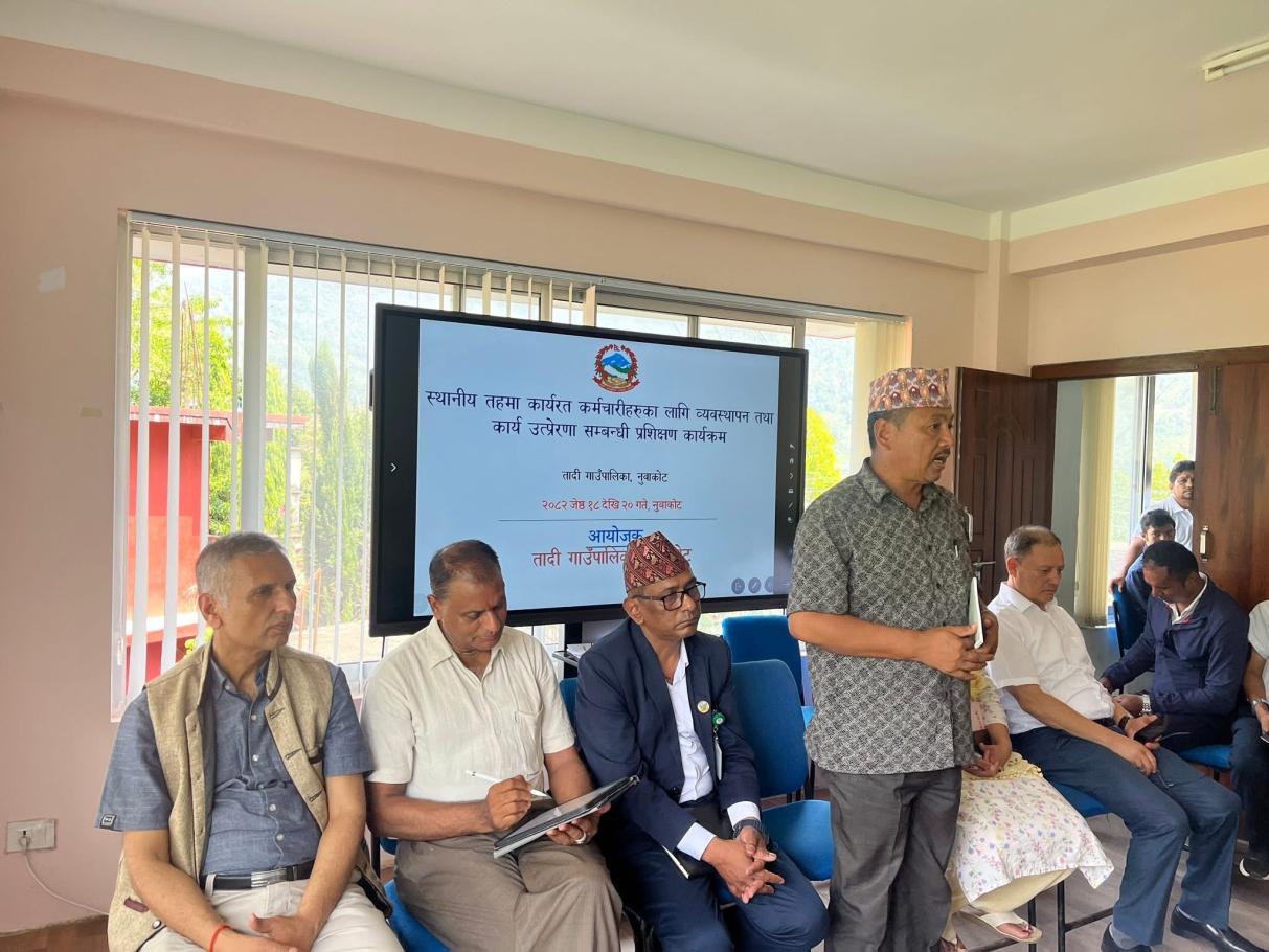 तादी गाउँपालिकाको आयोजनामा मिति २०८२।०२।१८ गते देखी २०८२।०२।२० सम्म संञ्चालन हुने ३ दिवशीय स्थानिय तहमा कार्यरत कर्मचारीहरुका लागि व्यवस्थापन तथा कार्य उत्प्रेरणा सम्बन्ध प्रशिक्षण कार्यक्रम मिति २०८२।०२।१८ गते तादी गाउँपालिका अध्यक्ष सन्तमान तामाङज्यूको अध्यक्षतामा सम्उदघाटन भई,बिशेष अतिथि उपाध्यक्ष श्री सन्जु प्याकुरेलज्यू ,अतिथिहरु प्रमुख प्रशासकीय अधिकृत श्री ध्रुब खनालज्यू,वडा अध्यक्ष श्री बच्चुराम तामाङज्यू,विज्ञ प्रशिक्षकहरु पुर्व सचिव श्री यादव कोइरालाज्यू, पूर्व नायव महान्यायाधिवक्ता श्री कृष्णजिवि घिमिरेज्यू,कानुन व्यवसायी श्री राजन कुमार केसी ज्यूको आतिथ्यतामा साथै तादी गाउँपालिक